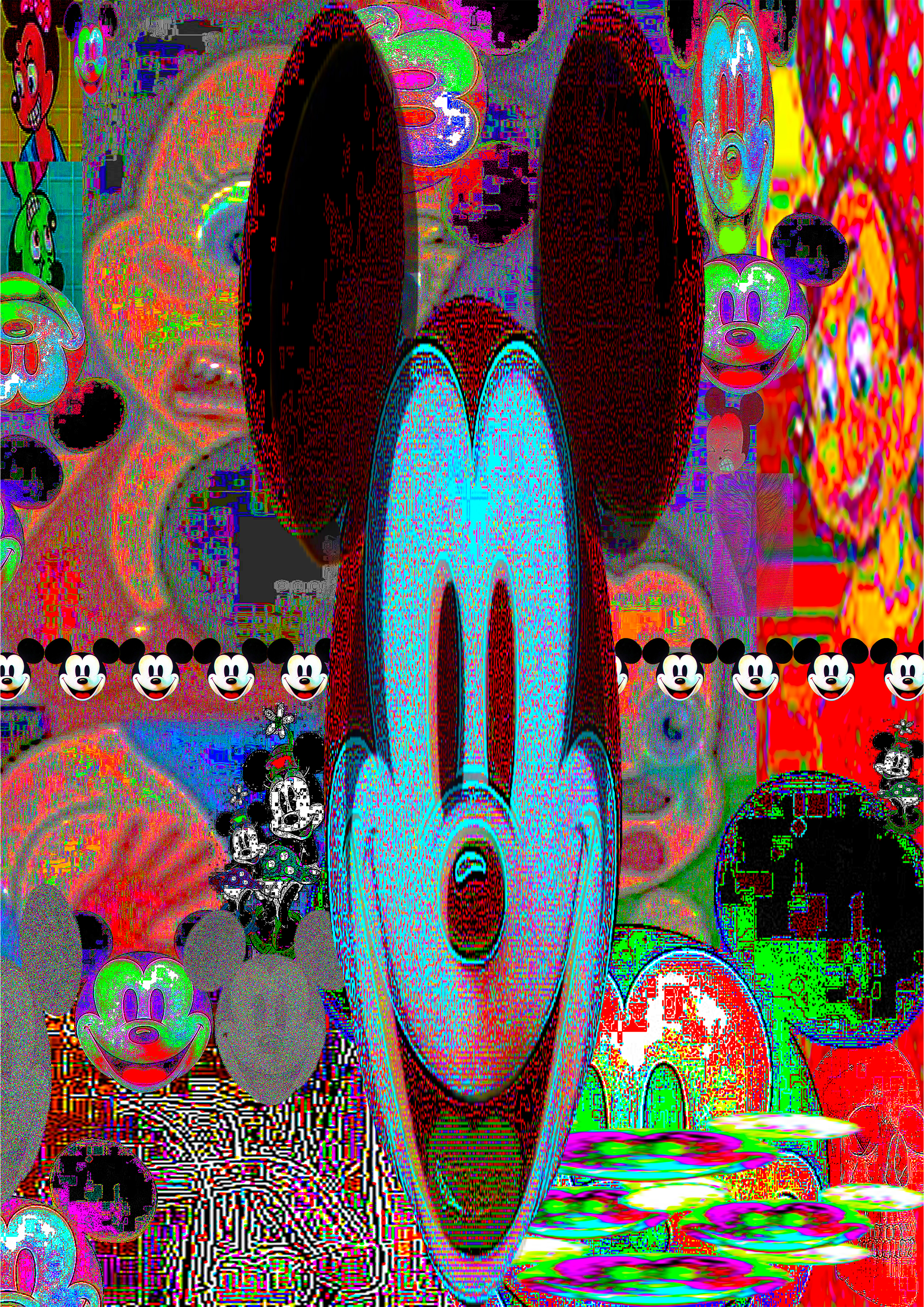 A poster as tribute to the icon Mickey. Icons like him are easily put out of context nowadays. Thats why this poster is a symbol for the communal usage of an icon. And how easy it is to put these icons out of context. This communal use creates a form of vagueness (noise). Is the Mickey Mouse we know nowadays as innocent als we knew him from the Disney cartoons or is he a sinister type.